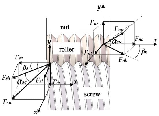 When the PRSM is loaded, the contact force between the thread teeth follows the normal direction of its spatial helical surface, which can be divided into three directions. The forces state of thread pairs as shown in Figure 4: Fxa is the axial force, Fxt is the tangential force of the normal load, and Fxr is the radial force. βs is the helix angle of the screw, βn is the helix angle of the nut, αsc is the normal contact angle between the screw and the roller, αnc is the normal contact angle between the screw and the roller.