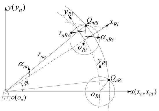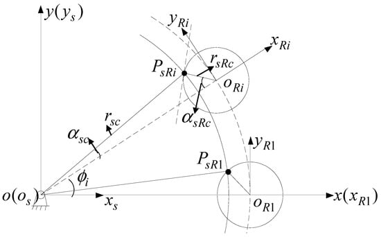 where αsc is the contact angle on the roller–screw contact side; βs is the helix angle of the screw; is the included angle between the connecting line, which consists of the axis of the i-th roller and the coordinate origin, and the positive direction of the x. It is also the phase angle of the i-th roller, which can be expressed as