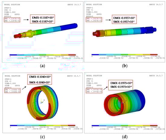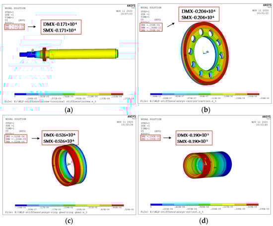The bending deformations of the screw, roller, ring gear and nut under radial load are shown in Figure 8a–d; Figure 9a–d shows the torsional deformation of the screw, carrier, ring gear and nut when subjected to torque.