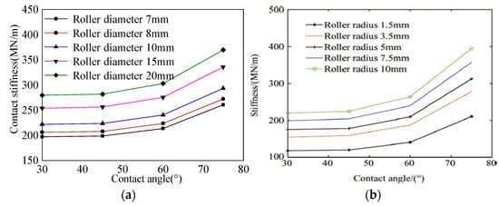 As shown in Figure 11a,b, the law for the change of contact angle on the contact stiffness is displayed based on the model in this paper and in Ref. [24], respectively. It is shown that when the rollers take different radii, the contact stiffness is enhanced with the increase in thread contact angle, and the growth rate increases.