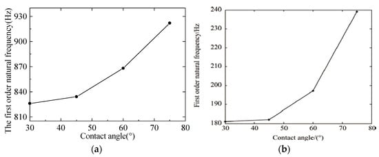 Influence of contact angle on the first natural frequency. (a) Model in this paper (b) Model in Ref. [24].