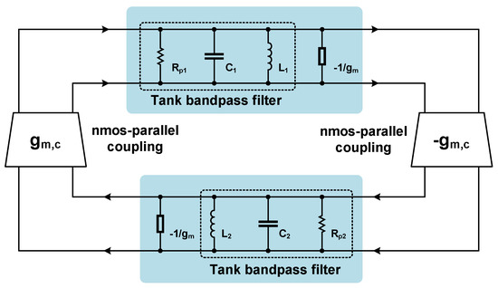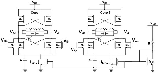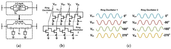 A simplified block diagram of the PQVCO cross-coupled with each other through transconductance () formed by the coupling NMOS transistors () is shown in Figure 3. The LC-tank circuits () form the tank band-pass filter at the resonance frequency and complementary PMOS-NMOS pairs () create the cell to compensate for tank losses. Quadrature phase accuracy can be improved with stronger coupling strength , but it leads to increased phase noise around the oscillation frequency. Therefore, the sizes of are chosen smaller (1/4 times) with respect to the core MOS devices () to minimize the phase noise contribution while maintaining the quadrature phase error within acceptable limits (<1). Due to symmetry in operation in the identical core structures, the PQVCO is likely to exhibit bi-modal oscillation [38]. But in presence of mismatch in the tank circuits or coupling devices one of the modes prevails and leads to oscillation with either 90 or −90 phase shifted outputs. The ambiguity in phase is resolved by introducing ring oscillator structures [2,39] at the output nodes. As shown in Figure 2b, two ring oscillators are provided and either of them can be enabled to direct the oscillation in either leading or lagging phases. The resulting waveforms of , , , based on different ring oscillator configurations are shown in Figure 2c.