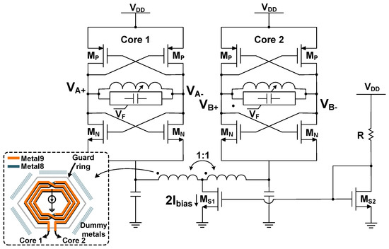Figure 4 shows a schematic of the SQVCO implemented for the TID experiment based on the architecture proposed in [39]. As elaborated in Figure 4, the two oscillator cores are identical in nature and the common-mode nodes are coupled with each other at 180 out-of-phase through a center-tap inductor. Ideally, in a differential configuration, the odd harmonics of the oscillator circulate through the switching core MOS devices, and higher order even harmonics appear at the common-mode node of the oscillator core. As per the super-harmonic injection locking mechanism [39], the second harmonics of each oscillator are mutually coupled with each other at 180 out-of-phase, and this leads to quadrature phase differences at the fundamental frequency component. Here, in this architecture a center-tap inductor is used in series with the bias circuit and each half is configured to resonate with the parasitic capacitors at twice the fundamental frequency. The second harmonic at the common-mode nodes are coupled magnetically through each half of the inductor and maintain a 180 phase difference between each other. A layout representation of the center-tap inductor working as the coupling transformer is shown in the bottom-left corner of Figure 4. The inductor is implemented in top-metal with dummy metal fillings and guard rings to prevent substrate coupling.