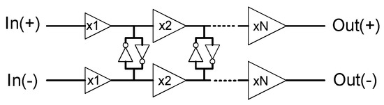 The off-chip driving strength of the differential output signal pairs from the oscillators are improved using cascaded CMOS digital buffers with increased driving strength. As shown in Figure 6 Two parallel chains of digital buffers are used in differential configuration with cross-coupled latches connected in between the nodes for phase alignment.