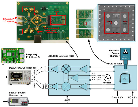 The prototypes of the quadrature LC oscillators (PQVCO and SQVCO) are implemented together in a single die using a commercial 9-metal 65 nm CMOS technology. An overview of the test setup used for the radiation assessment of the devices is provided in Figure 7. It consists of 2 printed-circuit-boards (PCBs) and the measurement equipment which are controlled by a raspberry pi 4 based controller board. The device-under-test (DUT) samples with the decoupling capacitors on the core and input-output () supplies are wire-bonded to peripheral-component-interconnect-express (PCIe) adapter boards. The micro-photograph of the fabricated die sample is shown in the top-right corner of Figure 7. The buffered quadrature outputs of the oscillators with an approximate frequency range of 2.5 GHz to 2.9 GHz are down-converted to an intermediate frequency (IF) of 500 MHz using an off-chip double balanced active mixer ADL5802. The DUT is connected to the mixer through the PCIe interface, and the mixer is driven by a differential local oscillator (LO) signal (2.4 GHz) generated from low phase noise VCO, ADF4351. The ADL5802 interface PCB with the DUT sample is placed inside the X-ray irradiation chamber. The differential IF quadrature output pairs from the on-board 1:1 balun transformer are brought out of the X-ray chamber to the Keysight DSA91304A oscilloscope using 2 m long sub-miniature version A (SMA) cables for frequency and quadrature phase measurement. The ADL5802 interface PCB and of the DUT are powered from a fixed 5 V and 1.2 V supplies respectively. One of the channels of the Keysight B2902A precision source/measure unit is used to provide 1.2 V to the and measure the current consumed. While the other channel is used to tune the varactor input voltage during the measurement. Additionally a PN9000 phase noise analyzer is utilized to measure the output phase noise of the free running quadrature oscillator.