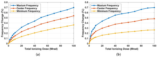 Percentage frequency variations of (a) PQVCO and (b) SQVCO measured with respect to the TID of the order of 100 Mrad (SiO).