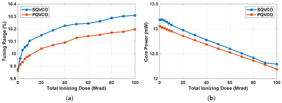 In the oscillators (PQVCO, SQVCO), the NMOS varactors are ac-coupled and therefore are not affected by the level of output common-mode voltages. As the varactor voltage is tuned from 0 to , the varactors’ gate voltage is always greater than the source and drain voltage and so they completely operate in accumulation-mode. The effects of oxide-trap charges and interface trap charges on the varactors with respect to bias voltage are analyzed in detail in [42]. During irradiation, the radiation induced negative charges (oxide-trap and interface trap) result into reduction of the width of the depletion region, which in turn increases the capacitance of the varactors [29,43]. This radiation-induced effect is counteracting previous induced increase in frequency. However, as elaborated in Equation (1) the combined effect of the increase in and the decrease in results in an increase of the frequency of oscillation. In the case of , the contribution of is less compared to that of . For lower values of , the effect of is much more dominant and, therefore, the relative variation of is more than . In the case of SQVCO, the effective impedance at the common-mode biasing node is larger compared to PQVCO because of the resonance of the coupling inductor. Therefore, the increase in the term is less in SQVCO than PQVCO, which results in a slightly larger relative variation of in PQVCO compared to SQVCO. The variations of the TR of the oscillators, which can be expressed as TR = 100 × ( − )/, are measured with respect to TID and shown in Figure 9a. After 100 Mrad (SiO) TID, the relative variation of TR of the PQVCO is 3.4% and that of the SQVCO is 4.4%. In spite of having similar relative variations of for both the oscillators, the relative variation of TR of the PQVCO is less compared to SQVCO primarily due to larger variations of in the PQVCO compared to the SQVCO.