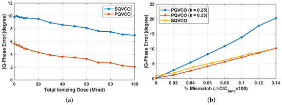 The variations of the absolute Q-phase error of the two oscillators are measured with respect to radiation up to a level of 100 Mrad (SiO). Before irradiation, the Q-phase error is larger (10) in the SQVCO compared to the Q-phase error (5.9) of the PQVCO. The Q-phase error largely depends on the mismatch between the tank resonance of the mutually coupled oscillator cores and the coupling strength of the I/Q phases. The variation of absolute Q-phase error of the two oscillators with respect to the mismatch of based on post-layout simulation results are shown in Figure 10b. With increasing mismatch between of the oscillator cores, the Q-phase error decreases. In the case of the PQVCO, the change in phase error is much more rapid with respect to the mismatch for lower values of the coupling factor (K). During the radiation experiment, the capacitance of the NMOS varactor with respect to the tuning voltage increases with respect to the radiation dose [29,43]. The increasing capacitances eventually reduce the relative mismatch between the . The effect can be seen with respect to radiation as the Q-phase error tends to reduce for both the oscillators as depicted in Figure 10b. As found from the simulation (Figure 10b), increasing the coupling strength (K) diminishes the effects of mismatches.
