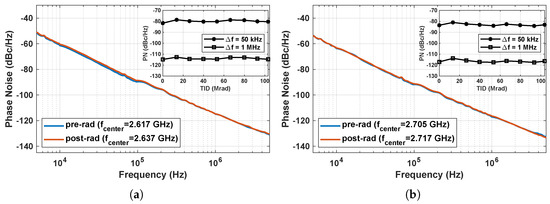 The phase noise characteristics of the PQVCO and the SQVCO measured at frequency are shown in Figure 11a and Figure 11b respectively. The blue lines show the phase noise contributions measured prior to radiation exposure and the red ones show the phase noise observed after 100 Mrad (SiO). As can be observed in Figure 11a,b the phase noise characteristics in the 1/ region (>300 kHz offset) do not undergo much variation. This is counter intuitive with 7% reduction in the bias current. Here, the oscillators are biased at the edge of the current-limited region to produce full swing outputs and achieve optimum phase noise performance. In this region of operation, the changing bias current has minimal effect on the phase noise characteristics [44] of the oscillators. Although, the thermal noise contribution of the cross-coupled core devices are supposed to increase with respect to TID [45], the overall phase noise characteristics in the 1/ region does not change much. This is primarily due to the wider device sizes as used in the cross-coupled pairs which reduce the thermal noise contributions in the phase noise characteristics. However, a close observation can reveal the close-in phase noise in the 1/ region (<300 kHz offset) increases slightly in the case of the PQVCO compared to the SQVCO. This is due to the extra pair of NMOS devices used for coupling the I and Q phases. The sizes of the devices are less compared to the core devices (coupling factor K = 0.25), and therefore contribute more 1/f noise. Overall, the phase noise characteristic of the SQVCO is slightly better than for the PQVCO due to the tail-noise filter [40] in the form of the coupling inductor present in the SQVCO.