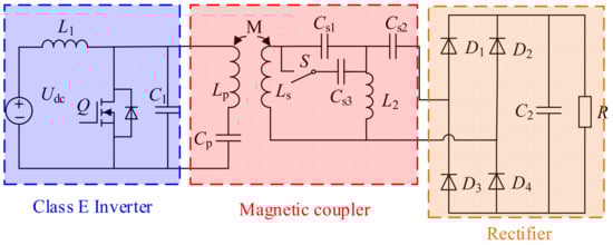 This proposed topology consists of an inverter unit, a magnetically coupled structure, and a high-frequency rectifier. Among them, the Class E unit is composed of L1, Q, C1, which transforms the input DC power into high-frequency AC power. The magnetically coupled structure is composed of Lp, Cp, Ls, Cs1, Cs2, Cs3, S, and L2, which transmits power from the transmitting circuit to the receiving circuit through a magnetic field. In the case that the switch S is closed, the receiving side capacitors are Cs1, Cs2; the system works in CC mode; when the switch S is on, the receiving side capacitors are a combination of Cs1 and Cs3 in parallel, and the system works in CV mode. The switch S is not a high-frequency switch, so it only needs to be switched once in the process of charging the battery. The high-frequency rectifier is a full-bridge rectifier, composed of four diodes, that can transform the high-frequency AC power to DC power and supply the load.