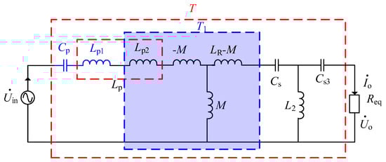 As can be seen from Figure 3, the primary inductor Lp is decomposed into Lp1 and Lp2, respectively. Cp compensates for the partial inductance of the transmitting coil Lp1, so that the T1 network can achieve the voltage source to the voltage source (V–V) transformation []. Cs refers to the secondary compensation capacitor and its value is subject to the state of the switch S. On the other hand, uin is expressed as a sine wave input voltage, the load is approximated as a pure resistance Req, the output voltage before rectification is Uo, and the output current is Io. Due to the fact that capacitor C1 is in parallel with the voltage uin, it does not affect CC and CV of the compensation network. Capacitor C1 only affects the ZVS characteristics of the system.