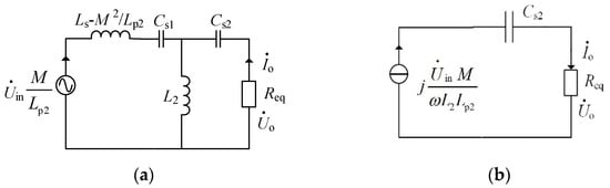 It is assumed that the system realizes CC output only at the frequency f. Moreover, in cases where the transmitting coil compensation capacitor Cp and inductor Lp1 are resonant at this frequency, the total impedance of Cp and Lp1 becomes zero. According to Thévenin’s and Norton’s theorem, the T1 network shown in Figure 3 could be equivalent to an inductor, given in Figure 4a. In case the equivalent inductor Ls − M2/Lp2, Cs1 and L2 resonate at f, the structure shown in Figure 4b can be obtained.