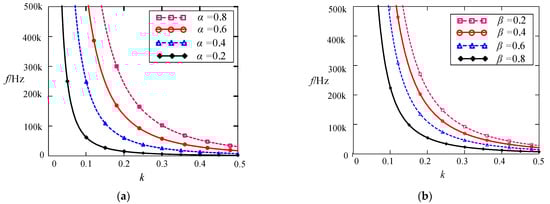 (a) switching frequency f versus the coupling coefficient k when α changes; (b) switching frequency f versus the coupling coefficient k when β changes.