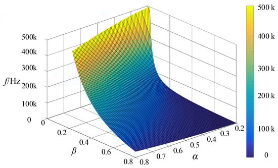 To show the relationship between parameters α, β, and frequency f, a three-dimensional image was created, as shown in Figure 7.