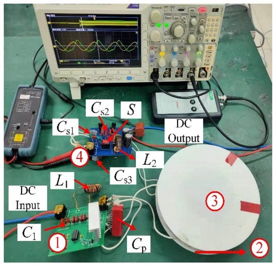 To verify the correctness of the above analysis and the feasibility of the proposed topology, a 180 W wireless charging prototype with 60 V/3 A was built using the proposed topology, as shown in Figure 9. The prototype is composed of an inverter unit, a transmitting coil, a receiving coil, and a rectifier marked as 1–4 in turn. Figure 10a,b present the uds and ugs in both CC mode and CV mode.