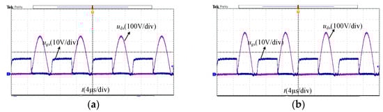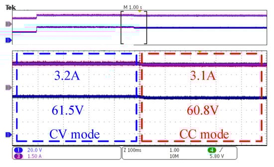 As seen in Figure 10, both modes achieved ZVS, and the blocking voltage of the switch in CC mode is smaller than that of CV mode by 25 V. Figure 11a,b show the waveform of output voltage and current as the power turns from full-power to half-power and then back to full-power in two modes, respectively.