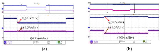 Waveform of output voltage and current. (a) Load 20 Ω-10 Ω-20 Ω changes in CC mode; (b) load 20 Ω-40 Ω-20 Ω changes in CV mode.