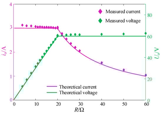 The measured and theoretical output voltage and current at different loads are shown in Figure 13.