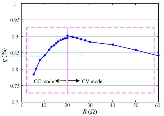 Finally, the curve of efficiency from the DC power source to the resistive load processed can be seen in Figure 14. It can be seen from the results that the max efficiency of CC mode is 89.5% and that of CV mode is 90.3%. Efficiency increases when the mode switches, which is because the output power will increase when it changes from CC mode to CV mode.