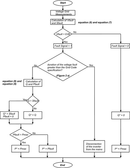 In Figure 3, the proposed LVRT strategy and the corresponding algorithm are shown. The operating conditions (normal or faulty) were set in accordance with the value of Vfault [20].
