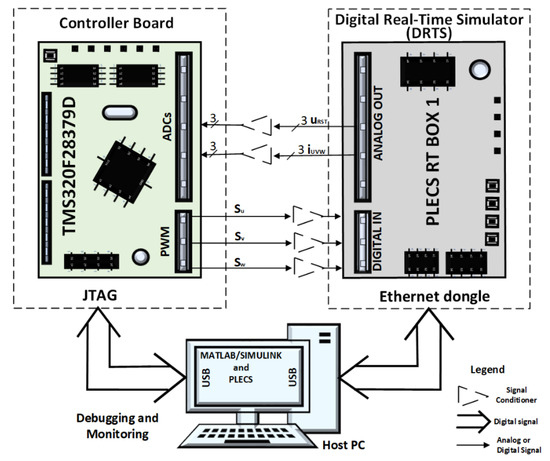 The step sizes for the DRTS and the microcontroller were TS = 5.1196 μs and TREG = 40.9568 μs, respectively. Moreover, the inverse of the switching frequency (fsw) had the same value as TREG for the synchronization between the sample time of the three-phase currents through the inverter and the digital PWM. The resulting controller delay was for the worst case [34].
