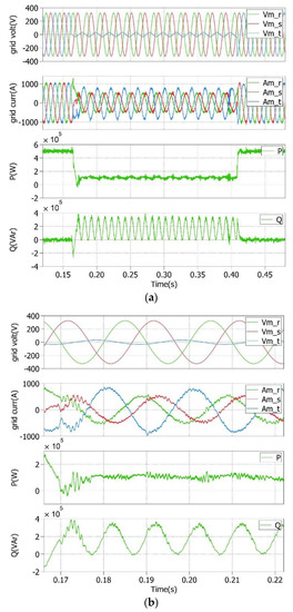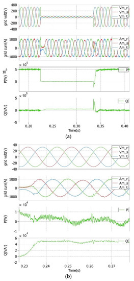 (a) Grid voltages and currents instantaneous active (P) and reactive (Q) powers during a symmetrical deep voltage sag of 90%; (b) detailed view during the faulty operating condition.