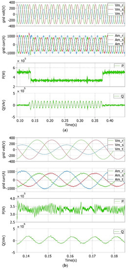 A constant active power control was applied in this article. Therefore, , whereas Q was allowed to strongly oscillate at 2ω0 when unbalanced faults occurred. In this case, according to [24], the active and reactive power reference commands (P* and Q*) were stated as: