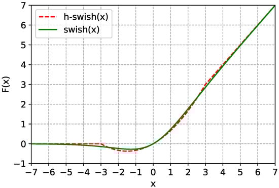 where represents the sigmoid function. The computational cost associated with the swish function on resource-constrained platforms is non-negligible. This prompted us to introduce the h-swish function to construct a nonlinear function that enables faster computing and is easier to deploy. The h-swish function is as simple as follows: