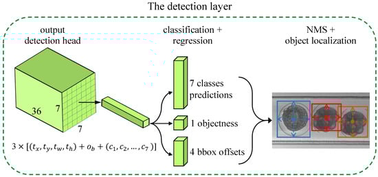 The detection layer in our network, named Det10, is inspired by YOLOv3, which enables the prediction of convolutional objects and the localization of bounding boxes to be performed in a single network. However, we only used one-scale feature maps to perform detection, and we only predicted seven classes, while YOLOv3 detected several objects at multiple resolutions, which was more complicated. Det10 uses pointwise convolution to integrate input feature maps into a fixed-size 3D grid cell (i.e., 1 ร 1 ร 36-stride1). The output tensor is an encoding of the objectness, class predictions, and bounding boxes. In our task, as the cell size does not differ hugely, we simply used a single scale to predict all three boxes, thereby preventing redundant cell detection from occurring in a feature pyramid regime. Following the CellConv backbone, the last feature extraction layer has an output stride of 32, indicating the output of the feature map is in width and height. Thus, at the detection layer, the final prediction tensor is for three bounding boxes. This tensor contains four bounding box offsets, one objectness prediction, and seven predictions of cell classes. The construction of our detection layer is illustrated in Figure 4.