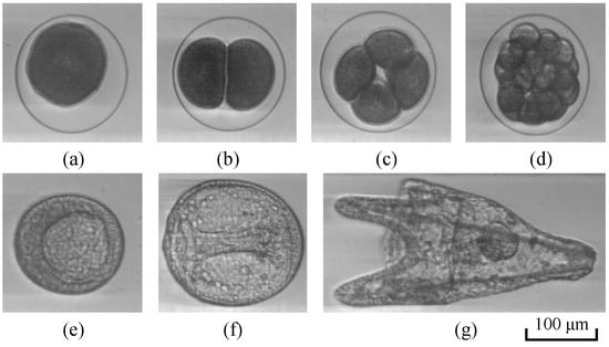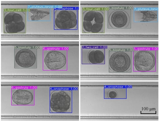 The detection dataset was constructed based on our previous works [], which aimed to design a real-time microchannel-based high-throughput cell morphology analysis system. We verified the performance of the hardware-implemented vision platform by conducting several experiments to analyze sea urchin egg cells in a straight microchannel [,]. The system consisted of a dual high-speed camera, a microscope, a metalโhalide light source, an electric syringe pump, and microfluidic chips with microchannels (; length ร width ร depth). Apart from feature extraction, the platform also recorded original images successively at 4000 fps in PC memory under magnification through a microscope. The cell dataset was composed of the portion of captured images. Figure 5 shows snapshots of sea urchin embryos at different phases after fertilization. In practice, each image may contain 1, 2, or 3 cells. Based on cytology, cell development is divided into seven different stages, i.e., fertilized (one-cell stage), two-cell stage, four-cell stage, anaphase, blastula, gastrula, and pluteus (larval). According to these criteria for cell classification, our custom cell dataset consisted of 11,839 annotated cell bounding boxes in 6589 images with variations in rotation, occlusion, and illumination. We split the dataset into three subsets: training, validation, and test, which included 4575, 1100, and 1014 images, respectively. Following common practice, we trained our model on the training set, then analyzed our method by performing ablation studies on the validation set. We report the results in terms of the mean average precision (mAP) on the test set in comparison with state-of-the-art methods.