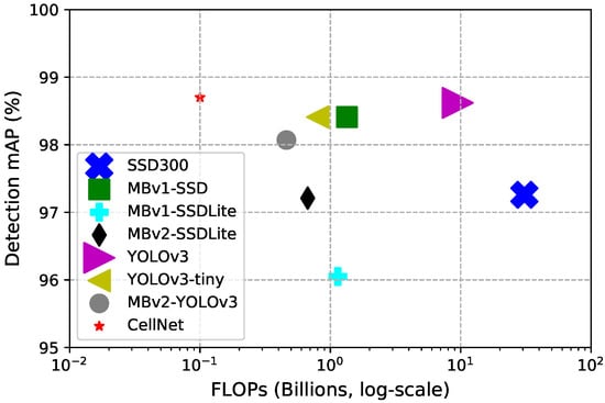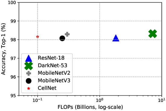 First, to shed light on the efficiency of the backbone we designed for CellNet, we evaluated the cell classification capability of the proposed method and compared the accuracy by using various measures of resource usage such as the number of parameters and FLOPs. The classification images were randomly cropped from the detection dataset described above. We compared our networks with four state-of-the-art models: ResNet-18 [], DarkNet-53, MobileNetV2, and MobileNetV3. Then, we studied the efficiency by comparing CellNet with the four representative models. Notably, Darknet-53 is the backbone of YOLOv3; the MobileNet series is widely recognized as being efficient and targets resource-constrained platforms. Table 3 presents the performance results. As can be seen in Table 3 and Figure 6, our CellNet uses an order of magnitude fewer parameters and 2.5ร fewer FLOPs than other models with similar accuracy.