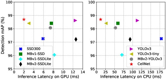 The results in Table 4 indicate that our CellNet achieved state-of-the-art cell detection performance with 98.7% mAP, even though it only needed 0.08 M parameters and 0.10 B FLOPs. Furthermore, when deployed on a GPU, it operated at 500.0 fps, and on a CPU, it ran at 87.7 fps, thereby demonstrating the effectiveness of CellNet in real-time high-speed cell detection. Compared with SSD300, our CellNet achieved 1.44% better accuracy with 306.9ร fewer parameters and was 307.9ร more efficient on the FLOPs. It is noteworthy that, to improve the AP of objects with both small and large sizes, SSD employs multi-scale detection strategies to fuse feature maps with multiple resolutions. The inference speed on the GPU was improved by 330.5 fps, from 169.5 fps to 500.0 fps, whereas it was 15.7ร faster than SSD300 on the CPU. The inference latencies on different platforms are presented in Figure 8, which shows CellNet on the top left of the two figures. This demonstrates the effectiveness of CellNet with respect to increasing the detection speed.