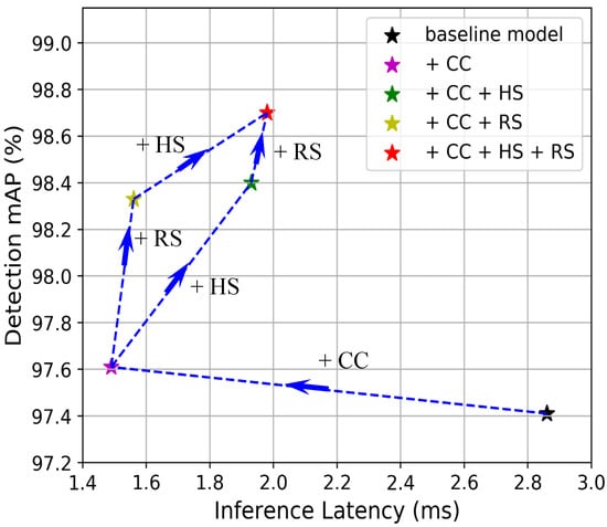 The impact of the different components on the mAPโlatency curve. Since our focus is on dedicated parallel computing equipment, we only report the processing time on the GPU. CC, RS, and HS denote CellConv blocks, residual connection, and h-swish nonlinearity, respectively.