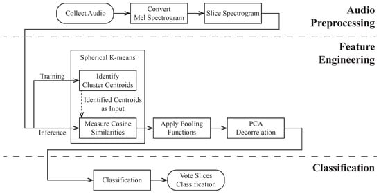 In the spherical k-means algorithm, a PCA instance is used to reduce the dimensionality of the input vectors prior to either fitting or projecting onto cluster centroids. The explanatory power of the PCA instance is determined by a hyperparameter termed explained variance. The explained variance controls the resolution of the “meta-spectrograms” entailed by the identified cluster centroids. During inference time, each shingled vector of a spectrogram is projected onto cluster centroids, and the cosine similarities between shingled vectors and cluster centroids are measured. Therefore, a spectrogram of n shingled vectors would have n vectors of cosine similarities. The vectors of cosine similarities is termed as the projection vectors and are vectors in R k , where k = i = 1 c k i is the total number of cluster centroids across all class-conditioned spherical k-means.