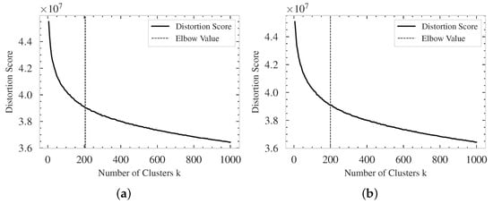 From the elbow plot shown in Figure 2, it can be observed that the distortion score decays exponentially with respect to the number of clusters k when k is less than the estimated optimal k, and linear decay is observed when k is larger than the estimated optimal k. Based on the observation, it is believed that the range of k values used to run the knee point algorithm is sufficient. If the range of k values is too small, the experiment may return an elbow plot that does not have such a distinctive pattern or even fail to converge. There is no practical benefits except increased experiment time if a larger range of k values is used.