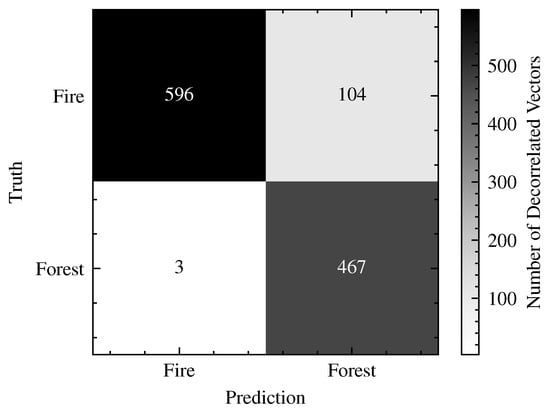 Based on the average estimated optimal k, the proposed data pipeline is trained with 4 different fixed ks in the range of [ 50 ,   200 ] with a step size of 50. The large range is selected due to the high standard deviation observed above. All the experimented classifiers reached 99% training and validation accuracy. However, the best-performing data pipeline can only reach 90% accuracy on the test dataset. The complete classification performance on the test dataset is presented in Table 1. It is observed that a data pipeline with a spherical k-means of k = 100 , SVM with C = 0.1 , and RBF kernel has the best performance among the 16 experiments executed. The confusion matrix of the best-performing data pipeline classifying the test dataset is presented in Figure 4. The proportion of time the pipeline identifies wildfire occurs vs. the mixing factor α is presented in Figure 5.