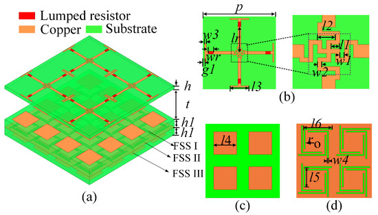 Topology and dimensions of the proposed FSR. (a) Overall FSR diagram. (b) Resistive layer. (c) FSS I and FSS III layer. (d) FSS II layer (h = 0.813 mm, t = 9 mm, h1 = 2 mm, l1 = 0.4 mm, l2 = 0.8 mm, l3 = 4.5 mm, l4 = 4.7 mm, l5 = 3.7 mm, l6 = 5.1 mm, w1 = 0.2 mm, w2 = 0.2 mm, w3 = 0.3 mm, w4 = 0.3 mm, g1 = 0.1 mm, lr = 4.8 mm, wr = 1 mm, r = 1.6 mm).