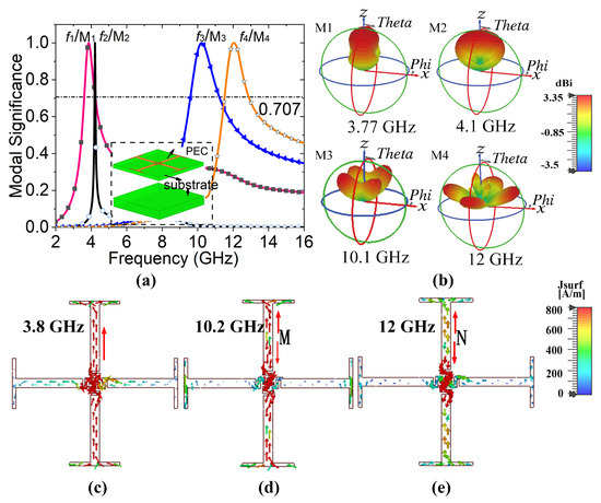 Characteristic mode analysis for the designed absorption structure. (a) Modal significance without R. (b) Modal radiation patterns. (c) Mode current at 3.8 GHz; (d) mode current at 10.2 GHz; (e) mode current at 12.0 GHz.