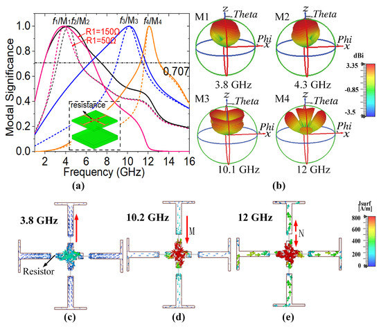 However, the bandwidth of MS > 0.707 is narrow. To enlarge the absorption bandwidth, the loss elements (such as lumped resistors) are loaded at metal locations with strong currents. After loading the lumped resistors, the MS of the absorption structure is shown in Figure 3a. It exhibited that the bandwidth of all modes has been broadened. As the resistance increases, the bandwidth will broaden accordingly. It can be seen from Figure 3b that M1 and M2 are effective modes. Therefore, we obtained a bandwidth with MS > 0.707 ranging from 1.9 GHz to 7.3 GHz. By observing the mode current distribution, it is obvious that the mode current of the structure is weak and the energy is absorbed by the resistors. Similarly, we analyze the mode current at 10.2 GHz and 12 GHz. Unlike the current distribution at low frequencies, the mode current is still strong when the resistors are added at 10.2 GHz and 12 GHz, as shown in Figure 3d,e. On the other hand, we can also see that the current changes direction at the point N at 12 GHz, while the current does not change at the point M at 10 GHz. It implies that the addition of resistors at 10 GHz has a greater effect than at 12 GHz.