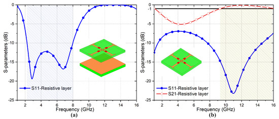 Finally, we obtain the absorption performance shown in Figure 4a. The resistive layer has a good absorption effect in the range of 2.1 GHz–8.0 GHz. Based on the above analysis of characteristic mode and mode current, it is found that the resistive layer resonances at frequency points 10.2 GHz and 12 GHz. In order to better explore the characteristics of these two resonance points, we studied the transmission/reflection coefficient of a resistive layer without a ground layer, as shown in Figure 4b. As observed, the resistive layer has a broadband transmission window ranging from 9.3 GHz to 15.9 GHz. Therefore, we can replace the metal ground in the absorption layer with a transmission structure to realize an FSR with absorption and transmission functions.