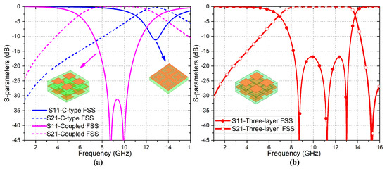Comparison of transmission characteristics between different FSS. (a) Transmission/reflection coefficients of the C-type FSS and coupled FSS. (b) Transmission/reflection coefficients of the three-layer FSS.