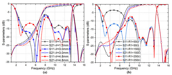 Next, the broadband FSS and resistance layer are integrated to form an FSR with a broadband transmission window, in order to analyze the effects of varied geometric and material parameters on FSR performance. The resistance value (R1) of the lumped resistor and the position (lr) of resistors are two key parameters that dominate frequency response performance of the FSR. Figure 6 is given to demonstrate the variation trend of the absorption and transmission performance of the proposed FSR with different lr and R1. As shown in Figure 6a, the IL at the transmission window of the designed FSR is mostly influenced by lr. According to the previous TCM analysis, the closer the resistance is to the tortuous structure, the better the absorption effect. Unfortunately, the position of the resistors can cause a serious impact on the IL at the passband. As can be seen in Figure 6a, when lr increases from 1.2 mm to 4.8 mm, the 1 dB transmission window increases from 9.3% to 36.4%. Figure 6b illustrates the absorption efficiency of the proposed FSR is controlled by the value of the lumped resistors. A large or small lumped resistor will lead to poor absorption band performance. After simulation and comparison of several parameters, the absorbing band and 1 dB transmission band are integrated, lr is 4.8 mm and the resistance R1 is optimized to be 150 to obtain the best absorption/transmission performance.