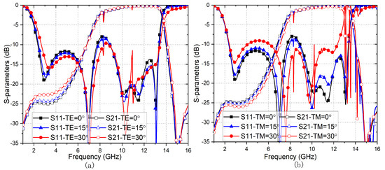 Figure 7 shows the frequency response of the proposed FSR for both TE and TM polarizations under different incident angles.The absorption performance of the proposed FSR becomes narrowed with the increase in incident angle under TE polarization, whereas under TM polarization, the absorption performance becomes deteriorated. The reason for this phenomenon is that the impedance of the incident EM is different under various polarizations. As the incident angle increases, the impedance mismatch increases, which leads to the absorption performance of the structure decreasing. Overall, the proposed structure can ensure its angle stability in the case of oblique incidence of 30. The main reason for the disturbance at passband under two polarization is that the design size of the top structure is too large, so grating lobes are generated at higher frequencies. The disturbance at higher frequency in Figure 7 is mainly caused by the top-layer structure, because the top structure is four times the size of the FSS layer.