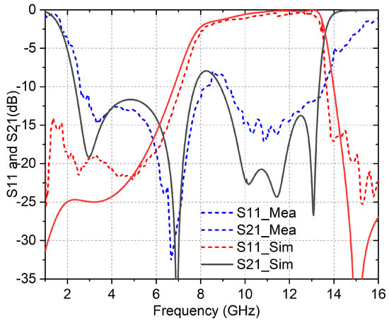 The reflection and transmission coefficients of the fabricated prototype were measured using the free space measurement method. The setup consists of two standard horn antennas and a network analyzer (Agilent N5230A). Two horn antennas are placed on both sides of the FSR sample when measuring the transmission coefficient, and two horn antennas are side by side toward the FSR sample while measuring the reflection coefficient. Figure 9 shows the measured and simulation results under normal incidence. It is observed that there is a good agreement between the simulation and experimental results. However, there is a slight frequency shift occurring between them, mainly due to unavoidable measurement tolerances and limitations on the electrical dimensions of the prototype.