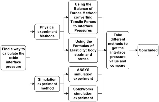 First, we used formulas for friction force and elastic mechanics to construct two methods for calculating the interface pressure of a cable. Second, we designed physical experiments related to the formula derivation, and measured and calculated the relevant data. Third, we analyzed cable interface pressure values using ANSYS (Version 19.2, ANSYS, Pittsburgh, PA, USA) and SolidWorks (Version 2021, SolidWorks, Concord, MA, USA). Lastly, we compared and analyzed obtained values from the previous steps to draw our conclusions. The flowchart of our methodology is shown in Figure 1.