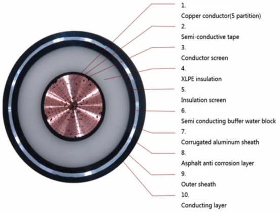 The basic structure of a power cable is composed of four parts: the core (conductor), insulating layer, shielding layer, and protective layer. The interior of a high-voltage cable is more complex, having a water-blocking layer and a protective asphalt layer. The sheath is composed of stronger materials. Figure 2 depicts a schematic diagram of the structure of a high-voltage cable. In this study, we used YJLW03 1 × 1200 (Shanghai Sanyuan Cable Accessories Co., Ltd., Shanghai, China) as a cable model, which is a power cable with cross-linked polyethylene insulation, a corrugated aluminum sheath, and a polyethylene outer sheath. Copper was the conductor, and the nominal cross-section was 1200 mm².