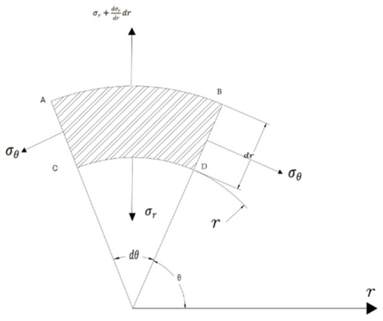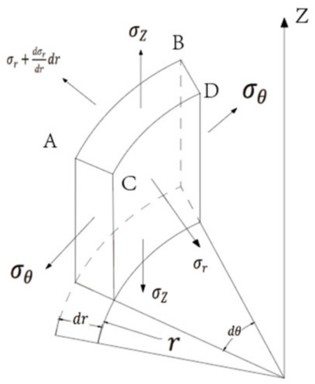 Suppose that the displacement component in the r direction is u, and the component in the z direction is w. Normal stresses σr, σθ, and σz, and radial displacement u are all independent of θ and z. A three-dimensional microelement body can then be transformed into a two-dimensional microelement body, and the relevant planar polar coordinates are established as shown in Figure 4.