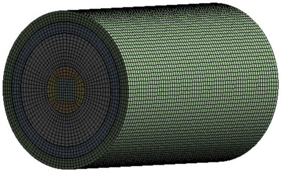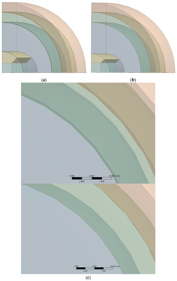 In preprocessing, we used Design Modeler in ANSYS Workbench for modeling. When modeling, we ignored the conductor-shielding, insulating-shielding, and water-blocking layers. From the innermost to the outermost layer were the conductor, insulator, aluminum alloy sheath, and polyethylene outer sheath. We used the form of a quarter circle during modeling and added symmetry settings during preprocessing. The modeling is shown in Figure 7a,b. Figure 7c shows the different interferences of the two models. The comparison in Figure 7c shows that the geometric interference method had overlapping inner and outer diameters.
