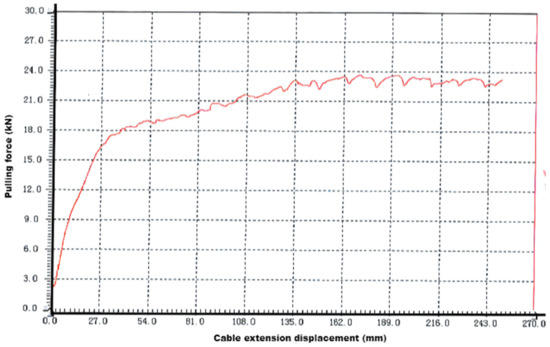Tensile force–displacement result of Experiment 1. Abscissa represents cable conductor displacement (mm), and ordinate represents applied tensile force (kN).