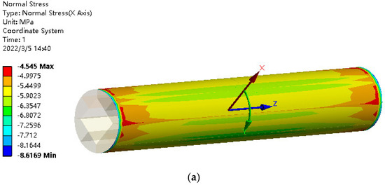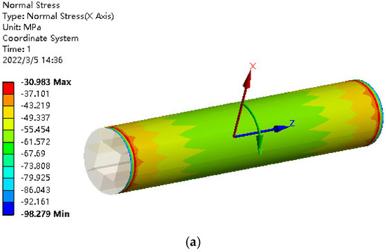 The contact pressure diagram is shown in Figure 13a,b. In Figure 13a, the yellow part is the value of the interface pressure between conductor and insulator calculated by the simulation software. Figure 13b shows the X-axis orthogonal stress diagram. The blue part in the middle is the conductor, the outer layer of the conductor is the insulator, and the interface pressure was generated in these two layers (Computer software expressing exponential powers is replaced by the letter E or e).